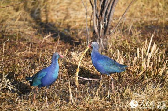 人民網大理2月3日電 近日,在云南大理洱海月濕地公園,50多只美麗的藍紫色水鳥吸引了游客的目光。經辨認,這群精靈為紫水雞,其被稱為“世界上最美麗的水鳥”。紫水雞除尾下覆羽為白色外,全身羽毛均為藍紫色,腳呈暗紅色。