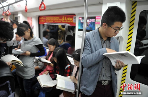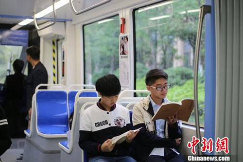 資料圖:江西大學(xué)生閱讀“占領(lǐng)”地鐵,呼吁民眾多讀書。劉占昆 攝