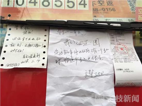 “貼了一張條說,警察同志,我回家拿一下東西,馬上就回來,敬請你原諒。”朱忠華告訴記者,“貨車停在小區(qū)門口,可能人家真有急事,人性化執(zhí)法,我們就想算了吧,而且他馬上就走了,不妨礙交通就行了。”見著紙條上語氣誠懇,而說好“馬上就到”,交警就網(wǎng)開一面,和同事到別處巡邏。