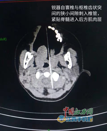 當(dāng)班醫(yī)生于第一時間請來擅長治療上頸椎病的姚浩群副主任醫(yī)師會診。據(jù)姚主任根據(jù)CT平掃判斷,竹簽經(jīng)寰椎與樞椎齒狀突之間的狹小間隙刺入椎管,緊貼脊髓進(jìn)入后方肌肉層。“竹簽已經(jīng)貫通椎管,并且所在的椎管正是呼吸、心跳等生命中樞所處的位置,因此如果進(jìn)行這一位置的異物取出,孩子隨時可能有生命危險(xiǎn)。”南昌大學(xué)第一附屬醫(yī)院姚浩群副主任醫(yī)師對王女士解釋道。