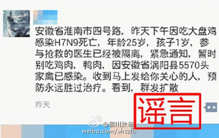 連日來,微博、微信朋友圈有消息稱:“淮南一市民昨天下午因吃大盤雞感染H7N9死亡,25歲,孩子1歲,參與搶救的醫生已被隔離,緊急通知,暫時別吃雞肉鴨肉。因安徽渦陽縣5570頭家禽已感染。收到馬上發給你關心的人,預防永遠勝過治療。看到,群發擴散。”19日,安徽省淮南市人民政府通過官方微博辟謠稱:“目前淮南市沒有發現人感染H7N9禽流感的死亡病例,朋友圈瘋傳的淮南市市民因感染H7N9病毒死亡的消息為假消息。