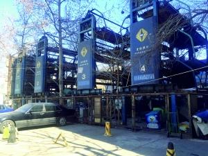 日前,記者來到工體南路小區,劉先生所說的立體車庫就在工體南路小區門口的停車場內最東側,四個高度超過十幾米的立體車庫并排擺放,共占地上百平方米。每個車庫上有8個停車坪,可供32輛汽車停放。但目前這些立體車庫均成“空架”,外殼、鋼管都銹跡斑駁,內部零件和設備凌亂散落。最低一層和周圍的地面上堆滿冰柜、舊家具、酒瓶紙箱等雜物,別說停放車輛,連落腳都難。車庫旁邊的兩三個簡易房還住著人,自稱從事貨運配送工作,對立體車庫的情況一無所知,“我們來的時候這兒就已經是這樣了,好多年了”。