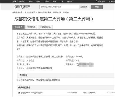 此外,在這些招聘廣告中,都沒有設(shè)置“學(xué)歷”、“年齡”、“語言”和“工作年限”的門檻,幾乎人人可以應(yīng)聘。更引人注目的是,該崗位均為高薪,月薪從1.5萬元至4.5萬元不等,甚至有“招聘者”標注該崗位為年薪30萬元-31萬元。北青報記者注意到,類似的“扛尸員”招聘廣告出現(xiàn)在獵聘網(wǎng)、趕集網(wǎng)和中華英才網(wǎng)等多家招聘網(wǎng)站,涉及的地區(qū)則涵蓋上海、武漢和成都等多地。8日下午,北青報記者隨機撥打成都的“李總”和武漢的“石總”電話,詢問招聘情況,但兩人均表示自己并非“第二火葬場”負責(zé)人,也從未發(fā)布過“招聘扛尸員”的信息。