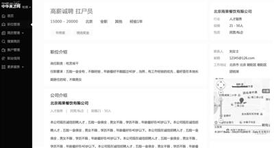 北青報記者以企業(yè)用戶身份,在中華英才網(wǎng)和趕集網(wǎng)上體驗注冊及發(fā)布招聘信息流程。在中華英才網(wǎng)注冊過程中,北青報記者注意到,“公司名稱”為必填選項。此外,還要求填寫“公司行業(yè)”、“公司性質(zhì)”、“公司規(guī)模”和“公司地址”等信息,但并不需要提交營業(yè)執(zhí)照等信息對企業(yè)用戶的身份進行認證。隨后,北青報記者隨意填寫了一家餐飲有限公司名稱、留下一個虛假電話,嘗試發(fā)布“扛尸員”招聘廣告。數(shù)分鐘后,該招聘信息發(fā)布成功。