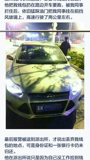 現(xiàn)代快報記者從小蓮提供的照片上看到,撿到錢包的男子駕駛的是一輛白色福特轎車。據(jù)介紹,對方意識到情況不對后,將錢包扔在路邊準備駕車逃跑,“我同事就追他,抓住他轎車的雨刮器,當(dāng)時為了讓他停下來,確實是砸了他擋風(fēng)玻璃的!毙∩彿Q,該男子被同事攔住后,“依舊猛踩油門把我同事掛在前擋風(fēng)玻璃上,高速行駛了兩公里左右!