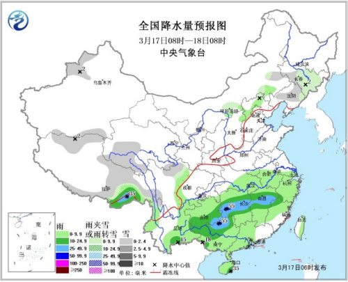 中新網(wǎng)3月17日電 據(jù)中央氣象臺網(wǎng)站消息,受南支槽東移加強影響,預計17日至20日,江南、華南等地將有一次較強降水天氣過程,雨量普遍在中到大雨,其中,廣西大部、廣東西部、湖南中部、江西中北部等地的部分地區(qū)有大到暴雨。