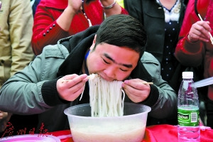 大胃王吃瀨粉比賽,既可以免費品嘗高明著名小吃,又可以獲獎。要獲獎并不容易,要一口氣吃完5斤瀨粉。經過一番比拼,一男一女分獲冠軍,他們將一大盆瀨粉一掃而空。