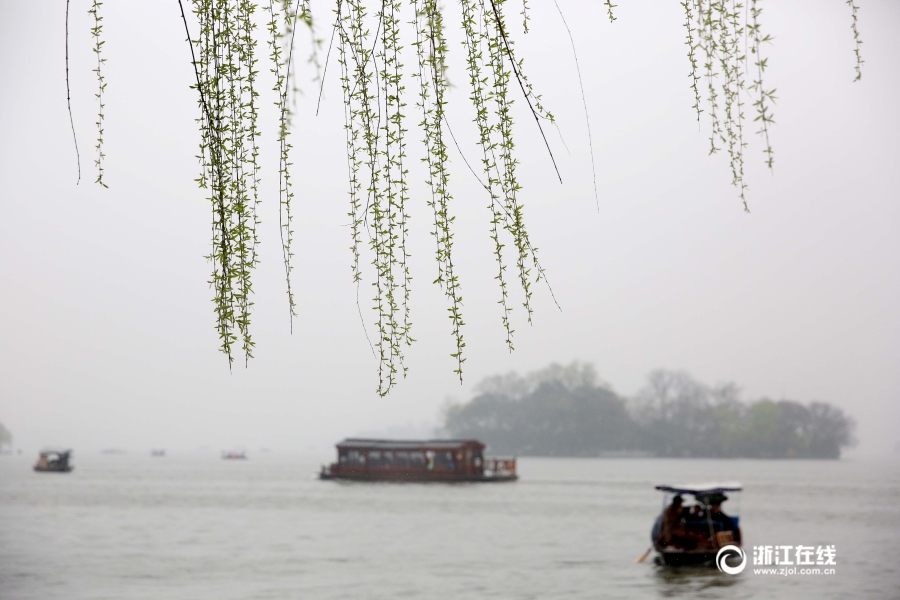 3月19日,杭城陰雨綿綿,西湖景區白堤兩岸桃紅柳綠,呈現出一幅“西湖美景三月天,桃紅柳綠又一春”的江南畫卷。(浙江在線記者 魏志陽 攝)