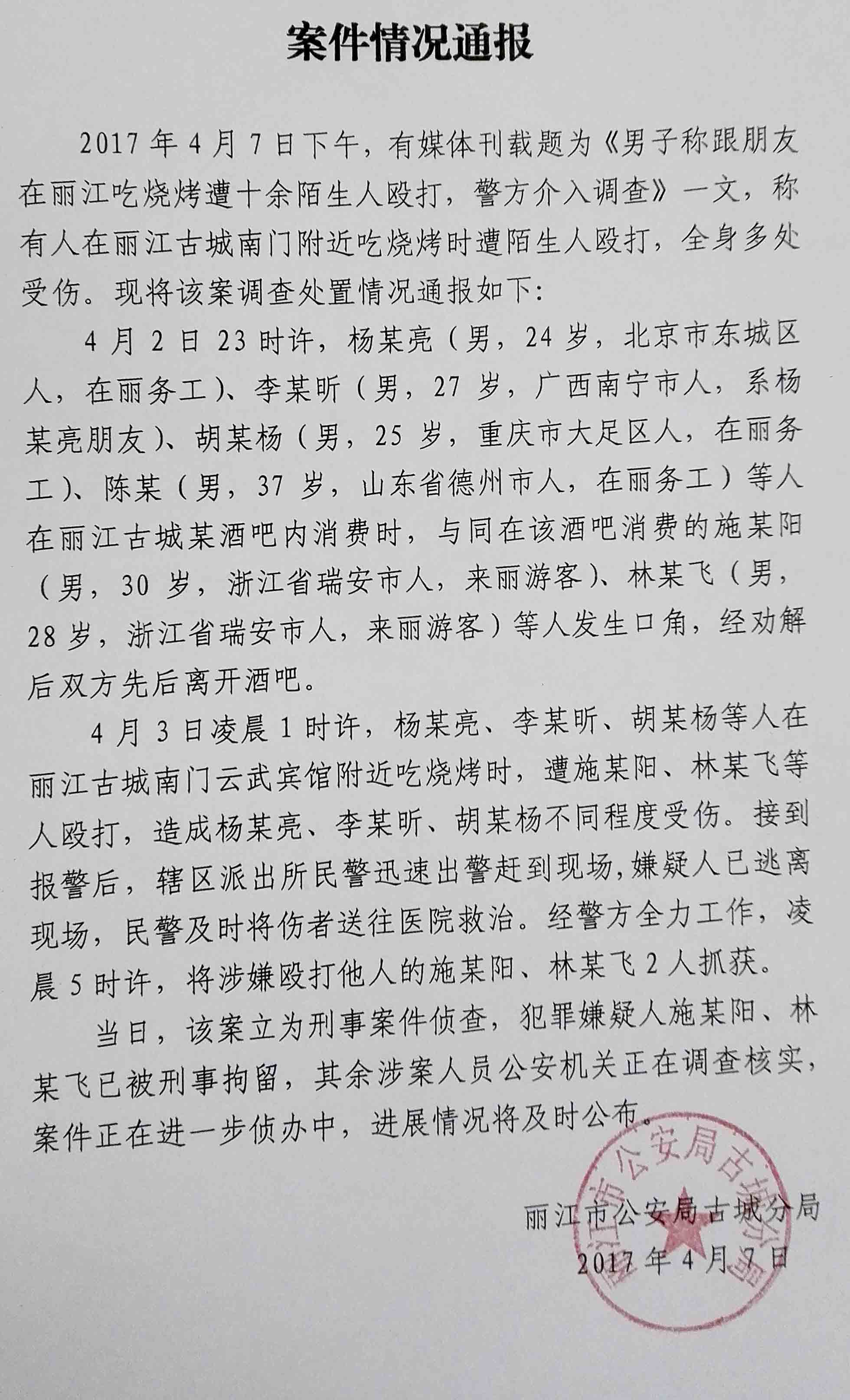 4月7日,有媒體報道一男子在麗江吃燒烤時被十余人毆打,造成全身多處受傷。下午,麗江市公安局古城分局就此案調查處置情況做出了通報: