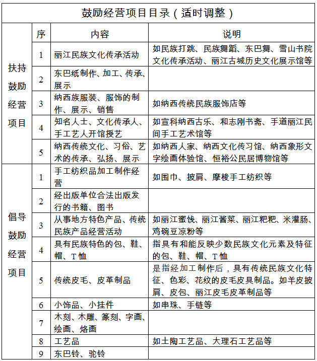 鼓勵(lì)經(jīng)營(yíng)項(xiàng)目是麗江古城文化遺產(chǎn)保護(hù)的重要內(nèi)容,通過(guò)實(shí)物、圖片、音像、表演等形式對(duì)民族文化進(jìn)行宣傳和介紹,以及傳統(tǒng)手工藝制品、地方特色產(chǎn)品和傳統(tǒng)民族產(chǎn)品的加工、制作及銷售等。