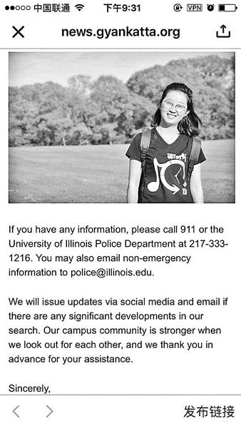 美國當(dāng)?shù)叵⒁部隙诉@一點(diǎn),根據(jù)章瑩穎在UIUC的指導(dǎo)教授管教授稱,章瑩穎在9日中午左右離開實(shí)驗(yàn)室大樓,她計劃前往位于林肯大道上的公寓簽訂新的租屋合約。