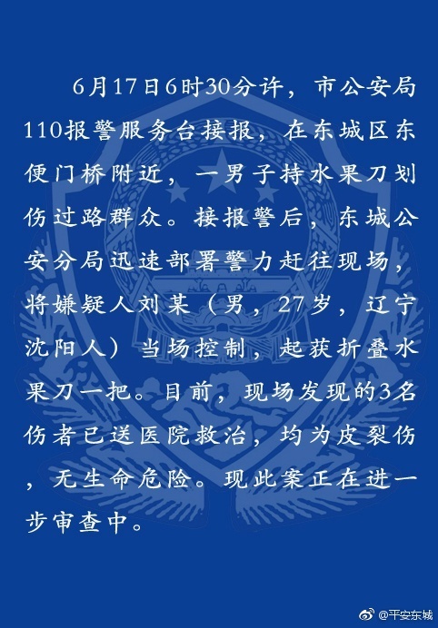 北京東城區一男子持水果刀劃傷3名路人 已被控制