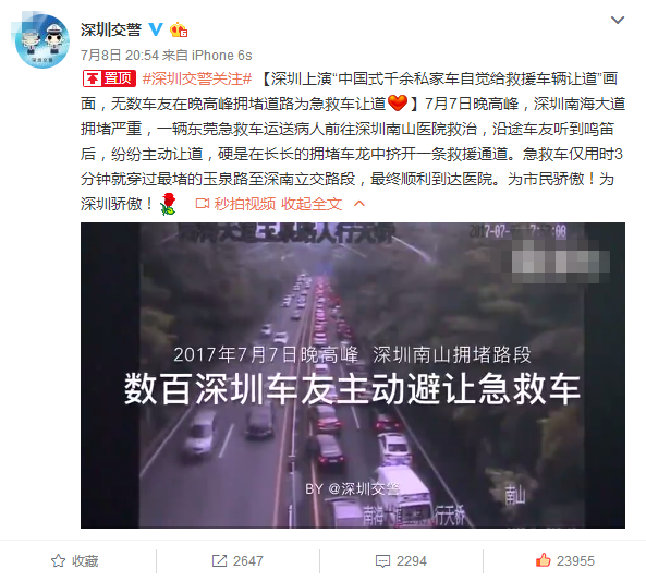一座有溫度的城市——深圳千余私家車自覺讓道急救車
