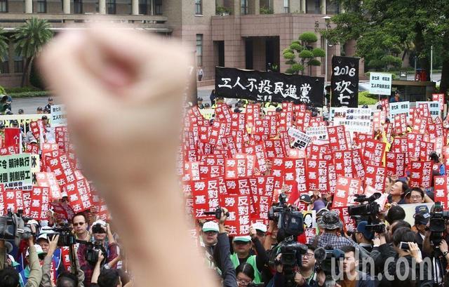 島內勞團9日上午號召各工會數百人集結在臺當局行政管理機構前抗議。(圖片來源:臺灣《聯合報》