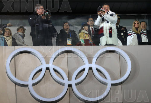 2月25日,韓國總統(tǒng)文在寅(前右)與國際奧委會主席巴赫(前左)在2018年平昌冬奧會閉幕式上。(新華社記者白雪飛攝)