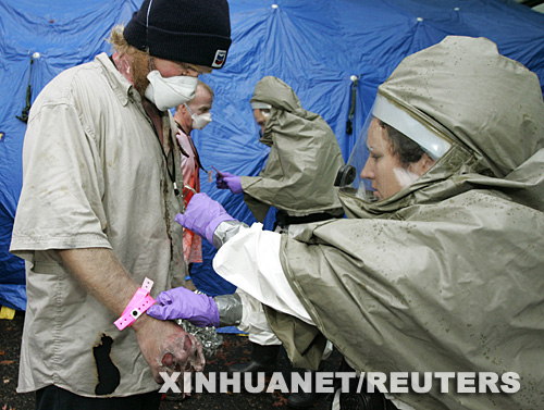 10月16日,在美國俄勒岡州波特蘭市,醫護人員在“臟彈”襲擊救援演習中護理“傷者”。新華社/路透