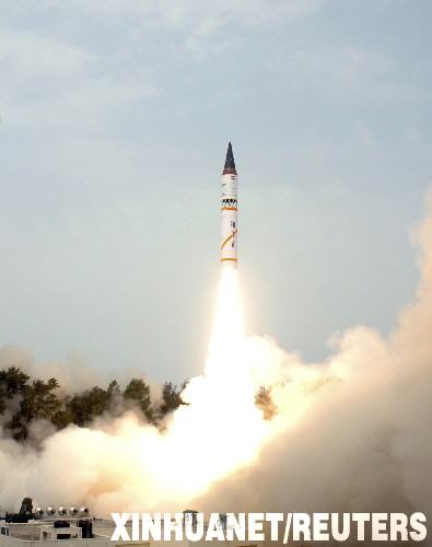 5月7日,印度在東部奧里薩邦附近的惠勒島發(fā)射一枚“烈火-3”型導(dǎo)彈。當(dāng)天,印度成功試射了這枚自行研發(fā)的遠程導(dǎo)彈。據(jù)印度政府說,它能夠攜帶核彈頭擊中3000公里以外的目標(biāo)。 新華社/路透