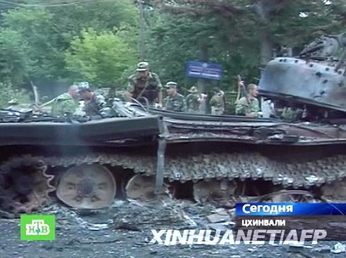 電視畫面顯示的是8月9日,在格魯吉亞南奧塞梯首府茨欣瓦利,一些南奧塞梯自治州武裝人員爬上一輛被毀的格魯吉亞坦克。據(jù)俄塔社報(bào)道,格魯吉亞總統(tǒng)薩卡什維利9日說,由于“俄羅斯侵略格魯吉亞”,他決定簽署命令宣布國家進(jìn)入“戰(zhàn)時(shí)狀態(tài)”。圖片來源:新華社/法新