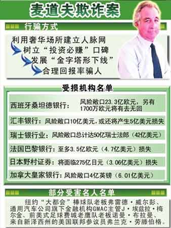 麥道夫的投資顧問公司以營運(yùn)證券業(yè)務(wù)欺騙投資者,他在交易中虧損了投資者的錢,卻以其它投資者的本金,借詞作為投資回報(bào)支付給另一些投資者,導(dǎo)致投資者損失數(shù)百億美元。