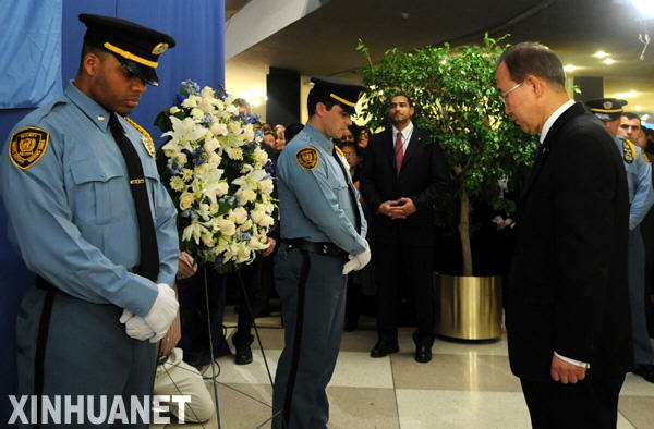 1月19日,聯(lián)合國(guó)秘書長(zhǎng)潘基文(右)在紐約聯(lián)合國(guó)總部為海地地震遇難者舉行的悼念活動(dòng)上默哀。當(dāng)日,聯(lián)合國(guó)總部舉行花圈敬獻(xiàn)儀式和燭光悼念活動(dòng),向在海地地震中遇難的聯(lián)合國(guó)工作人員及所有的地震遇難者表示哀悼。新華社記者申宏攝