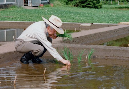 據日本新聞網報道,25日,日本天皇做起農民,親自下水田種植稻苗。