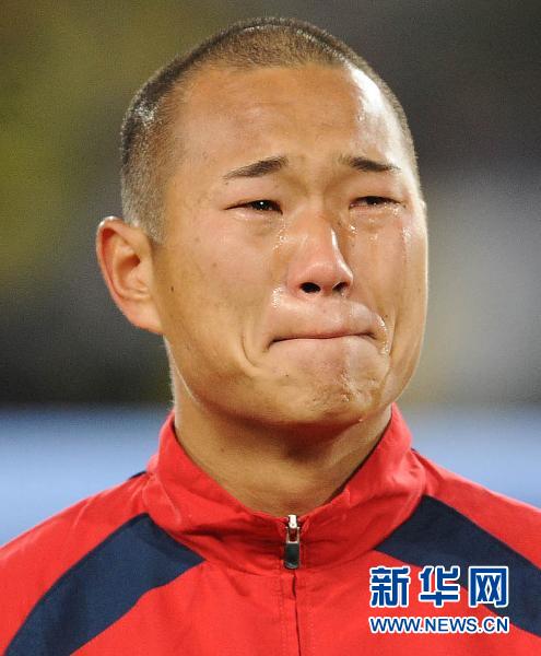 6月15日,朝鮮隊(duì)球員鄭大世在奏朝鮮國歌時(shí)淚流滿面。當(dāng)日,在2010南非世界杯小組賽G組比賽中,朝鮮隊(duì)對(duì)陣巴西隊(duì)。 新華社記者李尕?cái)z