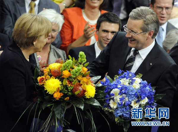 6月30日,在德國首都柏林,德國執政聯盟總統候選人、下薩克森州州長武爾夫(右)在當選德國總統后接受總理默克爾的祝賀。武爾夫在當天德國總統選舉中,經過3輪投票后當選第10任德國總統。新華社/法新