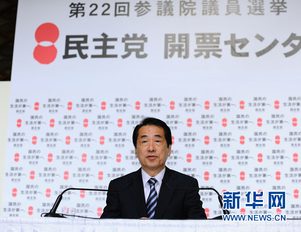 資料圖片:7月11日,在日本首都東京民主黨競選總部,民主黨代表(黨首)、日本首相菅直人出席記者會。據日本廣播協會電視臺報道,日本執政的民主黨在11日舉行的國會參議院選舉中失利,自民黨等在野黨占據了參議院超過半數的議席。新華社記者季春鵬攝