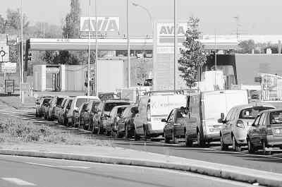 日前在法國的全國性罷工導致部分加油站鬧“油荒”。在法國南特,一家加油站外等待加油的汽車排起長龍。新華社發