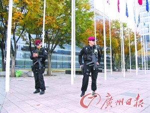 記者一到仁川國際機場,就能明顯感受到G20的氛圍。從仁川機場到首爾市區,峰會的官方會徽青紗燈籠標志到處可見。在G20首爾峰會的主會場COEX會展中心,全副武裝的特警在會場周圍24小時巡邏。