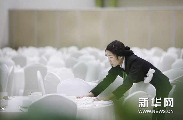 11月9日,服務員在韓國首爾G20峰會新聞中心內整理餐桌。韓國首爾G20峰會即將于11月11日開幕,會場內各項準備工作有條不紊進行中。新華社記者段卓力攝