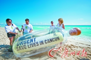 慈善組織在坎昆海灘放出一個(gè)巨大的漂流瓶,上面寫著“十萬火急,在坎昆挽救生命”。