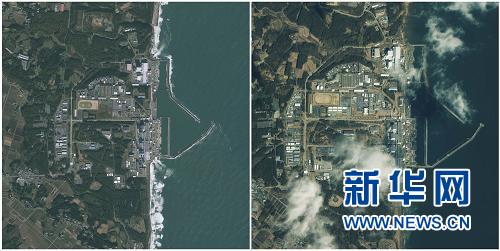 這張拼版衛星圖像顯示的是2009年11月15日(左)和2011年3月11日拍攝的福島第一核電站。