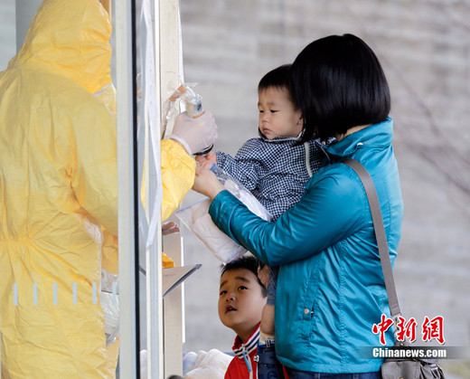 日本首相菅直人周一(14日)表示,在大地震和海嘯中受損的核電站仍然處于“警戒”狀態。東京電力公司周一向政府報告說,福島第一核電站輻射程度再次超過法定劑量。福島縣第一核電站在地震發生后已經關閉,但是因反應堆冷卻系統發生故障導致輻射超標。圖為在福島縣二本松,民眾隔離接受輻射檢測。