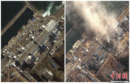 日本政府表示,當地時間15日晨6時10分左右,福島第一核電站2號反應堆附近傳來爆炸聲。早些時候的報道指出,福島第一核電站2號反應堆容器出現部分破損,這表明可能導致更為嚴重的核泄漏。圖為福島第一核電站爆炸前(左)后(右)對比圖。