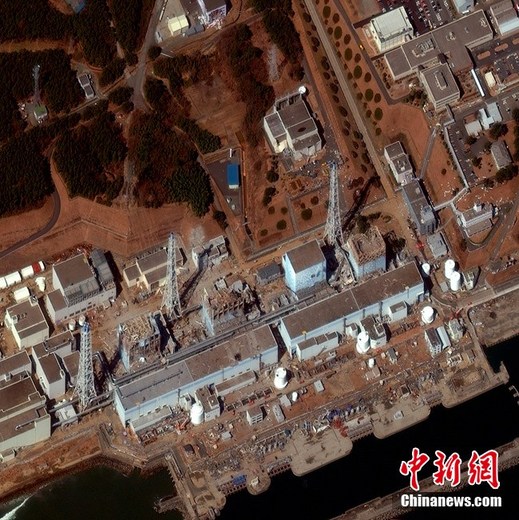 3月18日(當(dāng)?shù)貢r間上午10時03分)拍攝的衛(wèi)星照片顯示的是日本福島第一核電站。