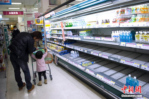 24日,由于東京部分自來水中檢測出的放射性碘超過嬰兒攝取上限,東京各大超市的飲用水瞬間被搶購一空。圖為東京港區某大型超市空空如也的飲用水柜臺。中新社發 孫冉 攝