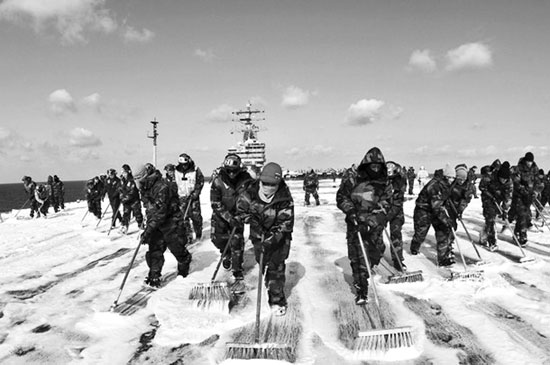 美國士兵對(duì)里根號(hào)航空母艦進(jìn)行清理作業(yè)