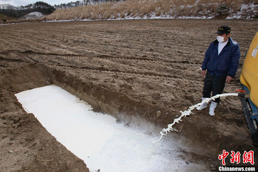 3月23日,日本福島縣Iitate,一位農民將牛奶倒入土坑中。福島縣周邊地區原奶和蔬菜等農畜產品的受輻射污染范圍23日呈擴大態勢,首相菅直人當天首次要求人們不要食用福島縣生產的一些種類的農產品。