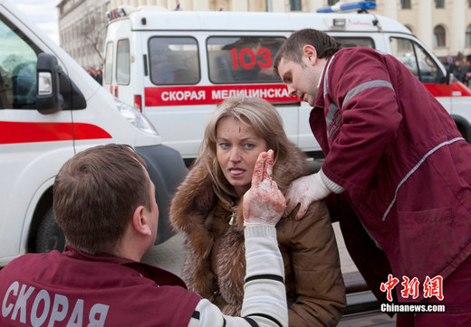 2011年4月11日傍晚6時許,白俄羅斯首都明斯克發生地鐵爆炸事件。事件已造成11人死亡,126人不同程度受傷。爆炸發生時刻,有兩列地鐵同時到達。爆炸所在地靠近白俄羅斯總統盧卡申科的官邸和明斯克最大的文化商業中心。圖為醫護人員檢查居民受傷情況。