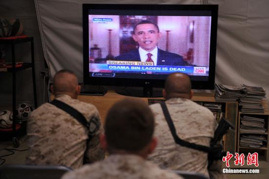 資料圖:2011年5月1日,美國總統奧巴馬發表全國電視演講,宣布“基地”組織領導人奧薩馬·本·拉登已被打死。圖為駐阿美軍某團士兵關注奧巴馬演講的電視新聞。