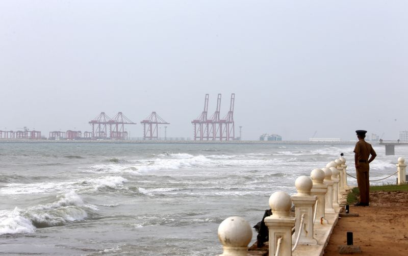 一位安保人員在斯里蘭卡科倫坡海濱執勤,遠處是中國參與投資興建的港口。