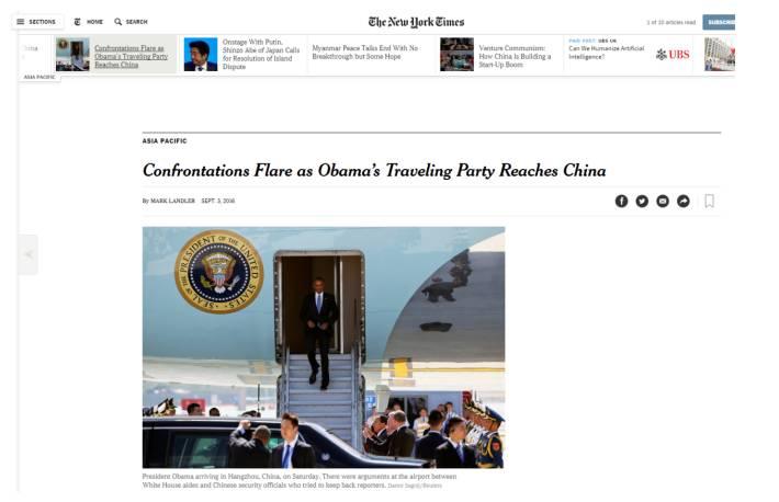 該報3日題為“奧巴馬剛到中國,對峙就爆發”的文章宣稱,奧巴馬乘坐的“空軍一號”在蕭山國際機場落地后,他并沒有從飛機的前門下機,而是反常地從機尾下機,且地面上也沒有紅毯;美國隨團記者們走下飛機,想記錄奧巴馬下飛機的一刻。但他們突然受到中國安保人員阻攔。隨后有白宮人員向該中國安保人員抗議,要求拍攝“我們的總統”。中國安保人員則回答,“這是我們的國家,我們的機場”。
