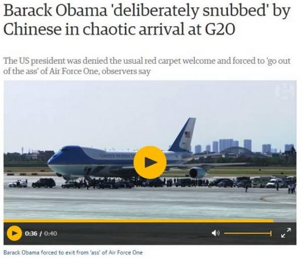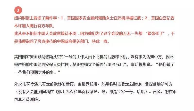 比如,根據《南華早報》的報道,一名匿名的中方人員透露,真實的情況是奧巴馬方面嫌中國運送樓梯的司機不懂英文,而當中方表示可以配翻譯時又被美方拒絕了,并表示奧巴馬可以從飛機尾部下機,于是才沒有了前門的樓梯和紅毯。