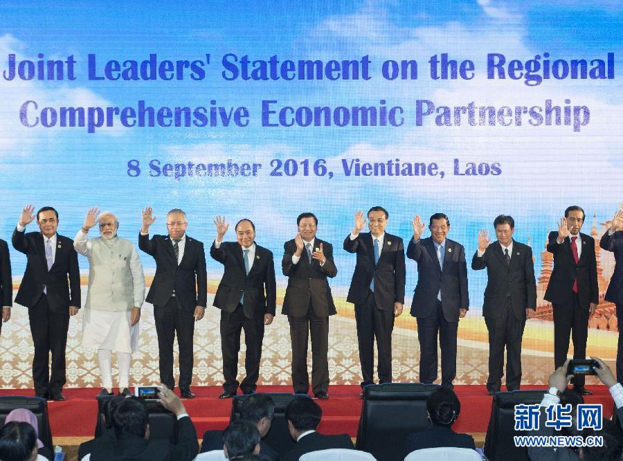 9月8日,中國國務院總理李克強在萬象國家會議中心出席第十一屆東亞峰會。峰會后,李克強與東盟十國及韓國、日本、印度、澳大利亞、新西蘭等國領導人共同出席《區域全面經濟伙伴關系協定》聯合聲明發布儀式。這是發布儀式上,李克強同與會領導人集體合影。新華社記者王曄攝