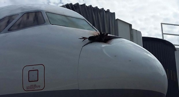 飛機的機鼻受到損壞,出現了很大的凹痕。可以看到機鼻上受到飛鳥撞擊后留下的血跡,甚至還有一只禿鷲尸體嵌在機身上,爪子外翻著,畫面十分血腥。
