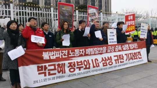 (韓民間團體抗議三星代工廠非法外派員工 圖片來源:韓國《mediatoday》)