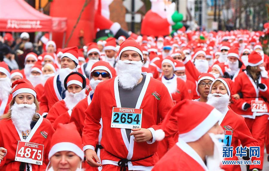 11月26日,在加拿大安大略省伯靈頓市,人們身穿圣誕老人服裝參加健身跑活動。當日,加拿大安大略省伯靈頓市舉辦一年一度的圣誕老人健身跑慈善活動,吸引了2000余名“圣誕老人”參與。新華社發(鄒崢攝)