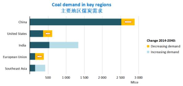 煤炭行業的未來處境可謂“雪上加霜”,主要地區煤炭需求不斷回落。IEA指出,中國的能源轉型是影響全球大勢的關鍵所在,煤炭消費達峰標志著煤炭行業的轉折點。未來煤炭需求將大幅回落,IEA預計2040年中國煤炭需求僅為2500百萬噸標準煤。為了控制空氣污染,減少碳排放,電力和天然氣將填補煤炭需求減少的空間,其中,天然氣的使用量將在21世紀30年代超過煤炭。