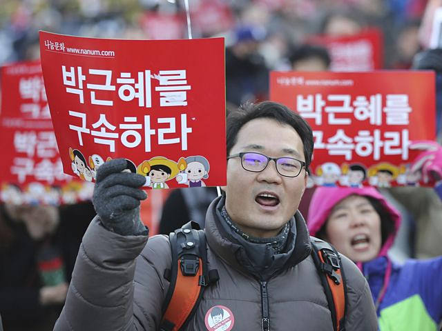 12月10日,抗議者舉著要求逮捕樸槿惠的標語牌,向首爾市中心青瓦臺總統府方向走去。(新華/美聯)